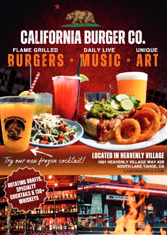 Brought to you by the same folks behind Base Camp Pizza, Azul Latin Kitchen, Fireside Pizza, and Rubicon Pizza comes California Burger Co – a gourmet burger establishment that is all about Burgers, Music, and Art. Our bar offers more than 100 whiskeys, and our chef is a graduate of Cordon Bleu. He also attended the Italian Culinary Institute in Costigliole d’Asti in Northern Italy and brings to you what we hope will be the best burger in Tahoe. Our burgers are made from USDA certified natural, free range, grass fed, hormone free cows, and we promise you’ll taste the difference.