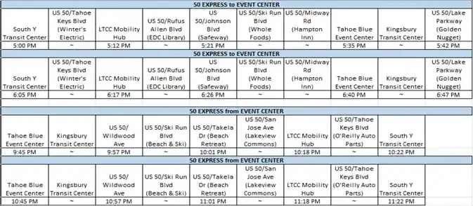 The Route 50 Express will operate between the South Y Transit Center and the Kingsbury Transit Center, with stops outlined in the schedule below. Parking along the route is limited; however, free parking is available at the garage on Kahle Drive near eastbound US 50 and the Lake Tahoe Community College (LTCC) Mobility Hub. The first bus will arrive at the Tahoe Blue Event Center at 5:35 PM, one hour before doors open, and the last bus departs at 10:45 PM.