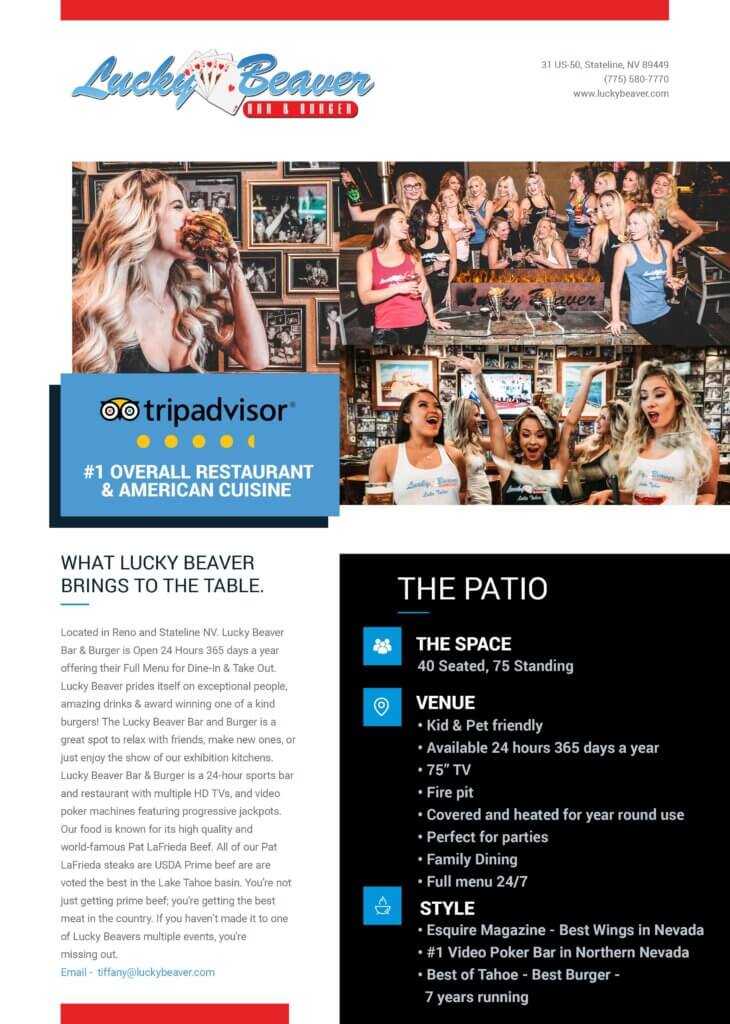 Located in Reno and Stateline NV. Lucky Beaver Bar & Burger is Open 24 Hours 365 days a year offering their Full Menu for Dine-In & Take Out.