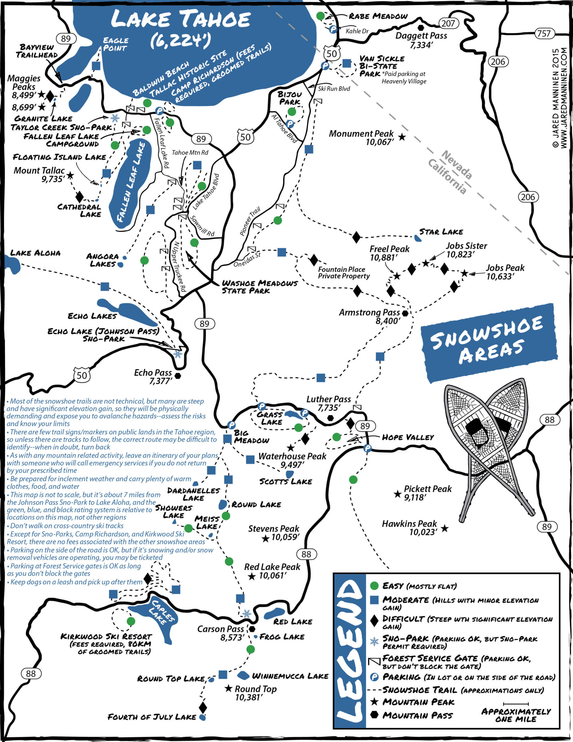 You’ll find flat areas to snowshoe at Pope, Kiva, and Baldwin Beaches, as well Camp Richardson (no pets, trail pass required), Tallac Historic Site, Fallen Leaf Lake Campground, Taylor Creek Visitor Area, and Taylor Creek Sno-Park (permit required). Park at Mount Tallac Road to access Floating Island and Cathedral Lakes and Mount Tallac. If you plan to conquer Tallac, you’ll have to contend with over 3,000’ of elevation gain and a lot of exposure.