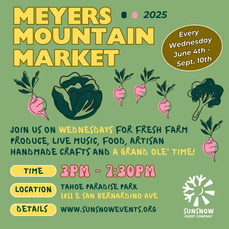 The Meyers Mountain Market, a CA-certified farmers Market, is open for its fifth season on Wednesdays from 3pm to 7:30 pm at Tahoe Paradise Park!